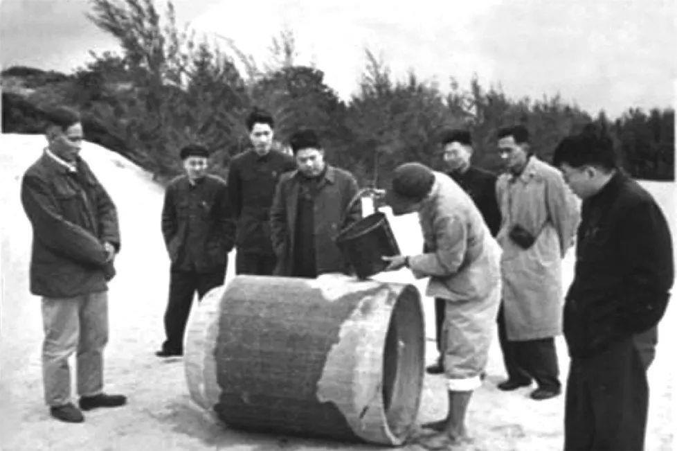△ 谷文昌在湖尾地下水工地與工程技術人員一起試驗濾水管。