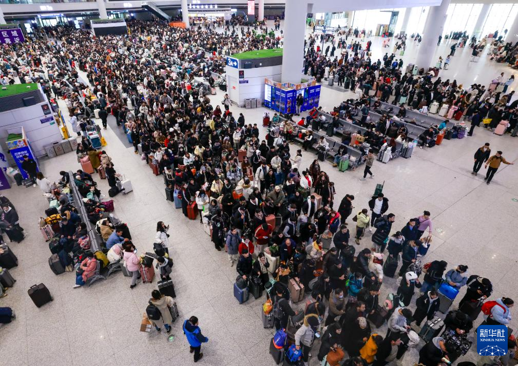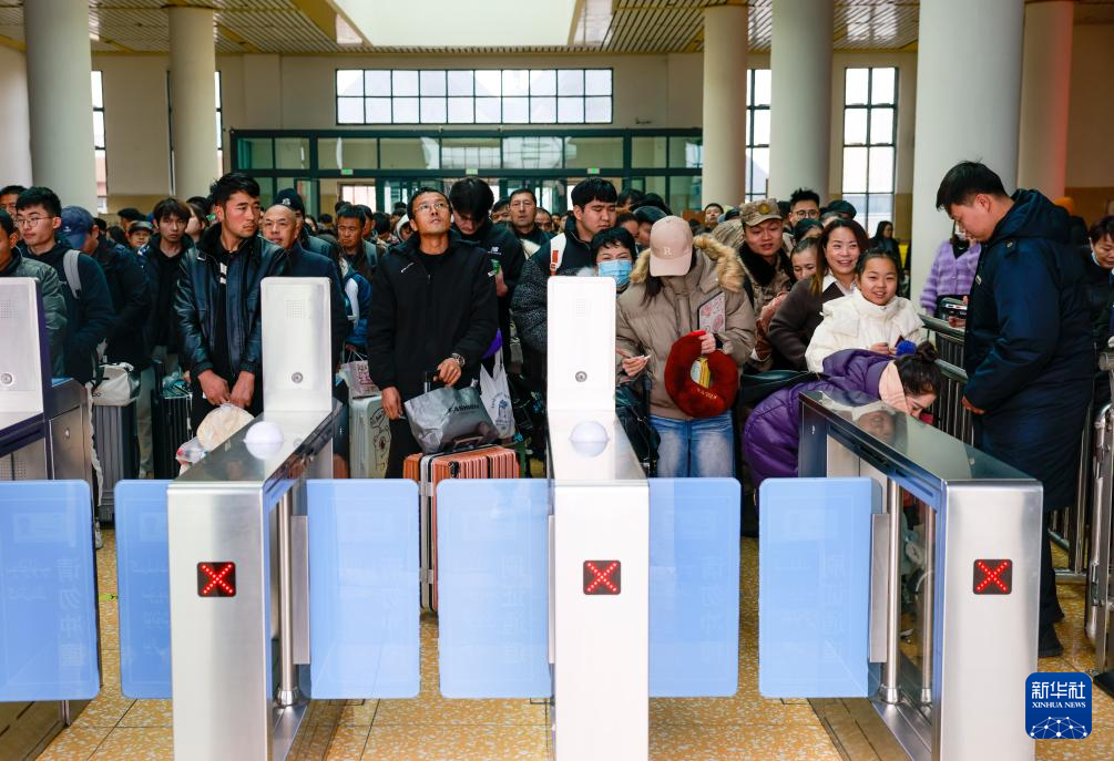 在喀什站候車大廳,工作人員引導旅客乘坐7557次列車(1月2日攝)。