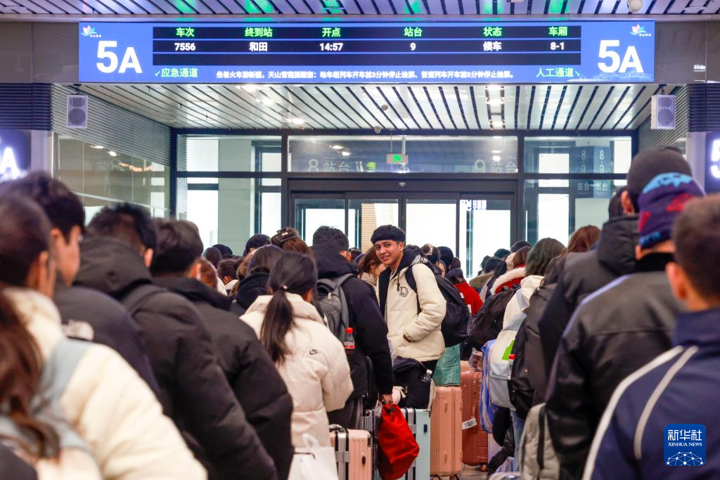 1月9日,在烏魯木齊站候車大廳,乘坐7556次列車的旅客在排隊等待乘車。
