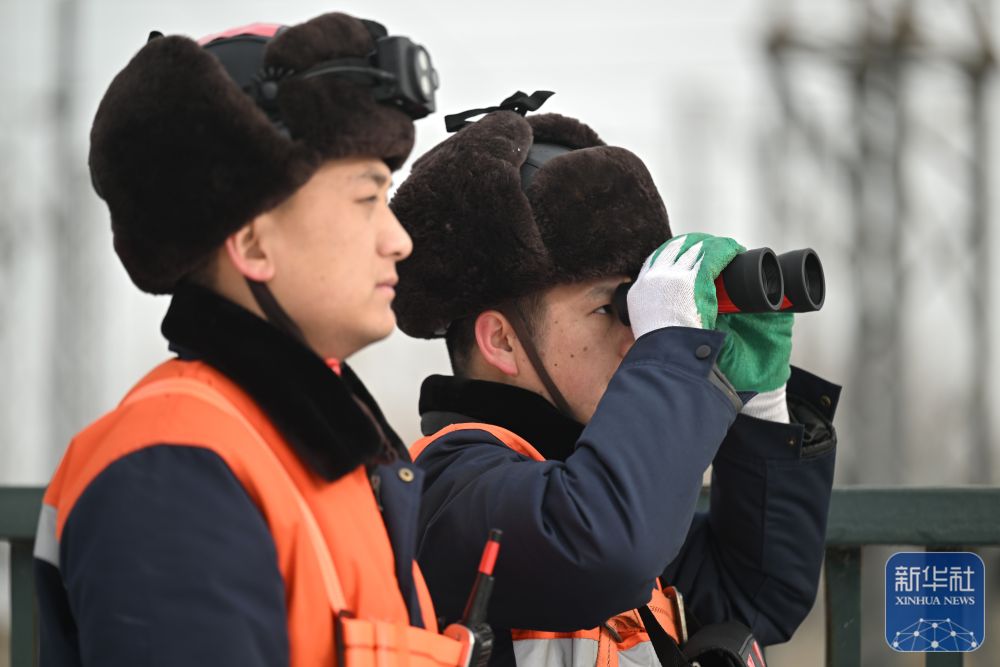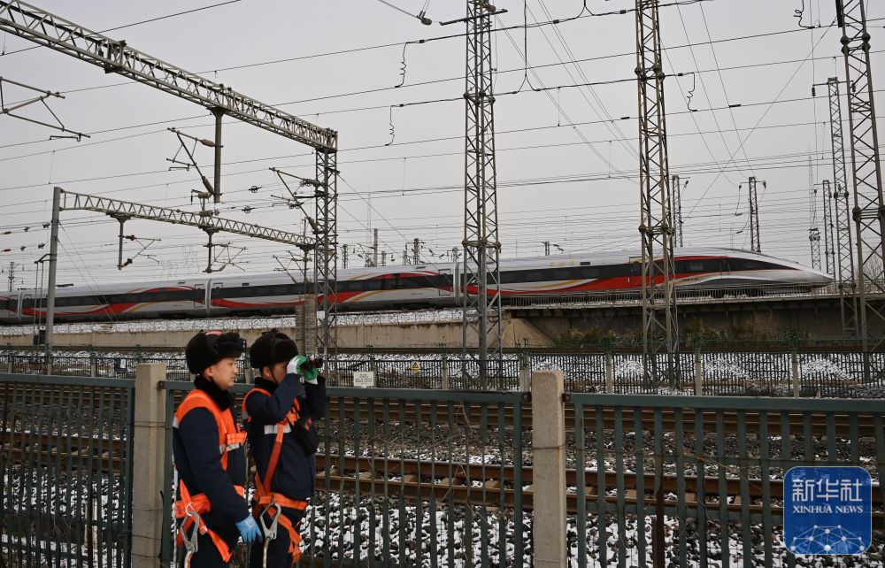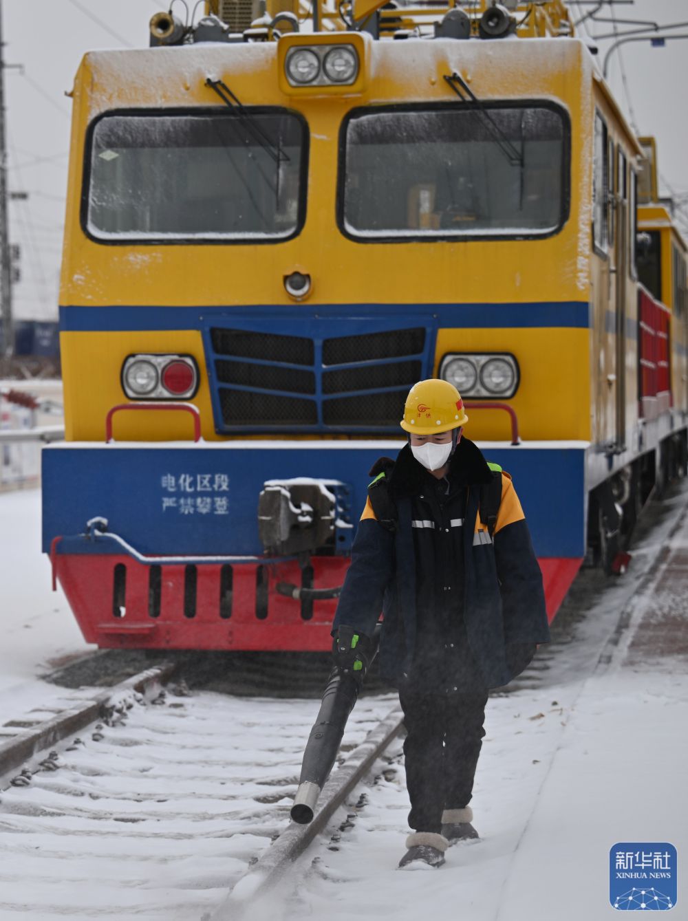 寒潮來襲,中國鐵路北京局集團有限公司天津供電段供電維修車間組織應急搶險人員上崗待命,在雪后對鐵道上方的接觸網運行狀態進行巡視,確保春運期間供電設備安全運行。