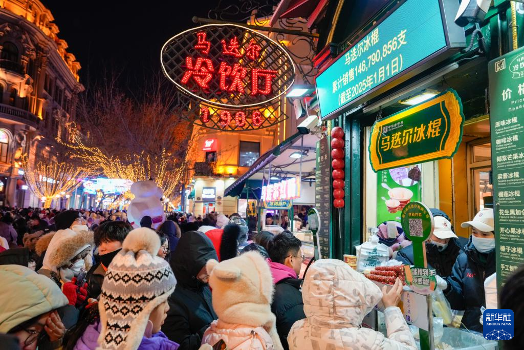 1月30日,游客在哈爾濱中央大街上的馬迭爾冷飲廳購買冰棍。