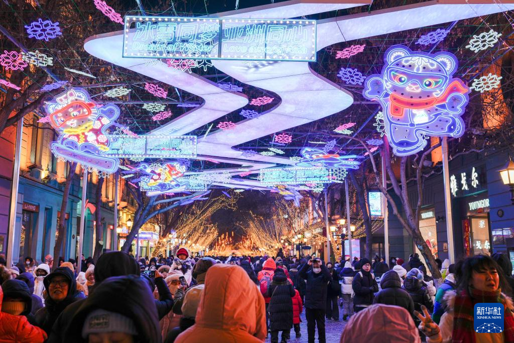 1月30日,游客在哈爾濱中央大街上的亞冬會主題燈飾下游玩、拍照。