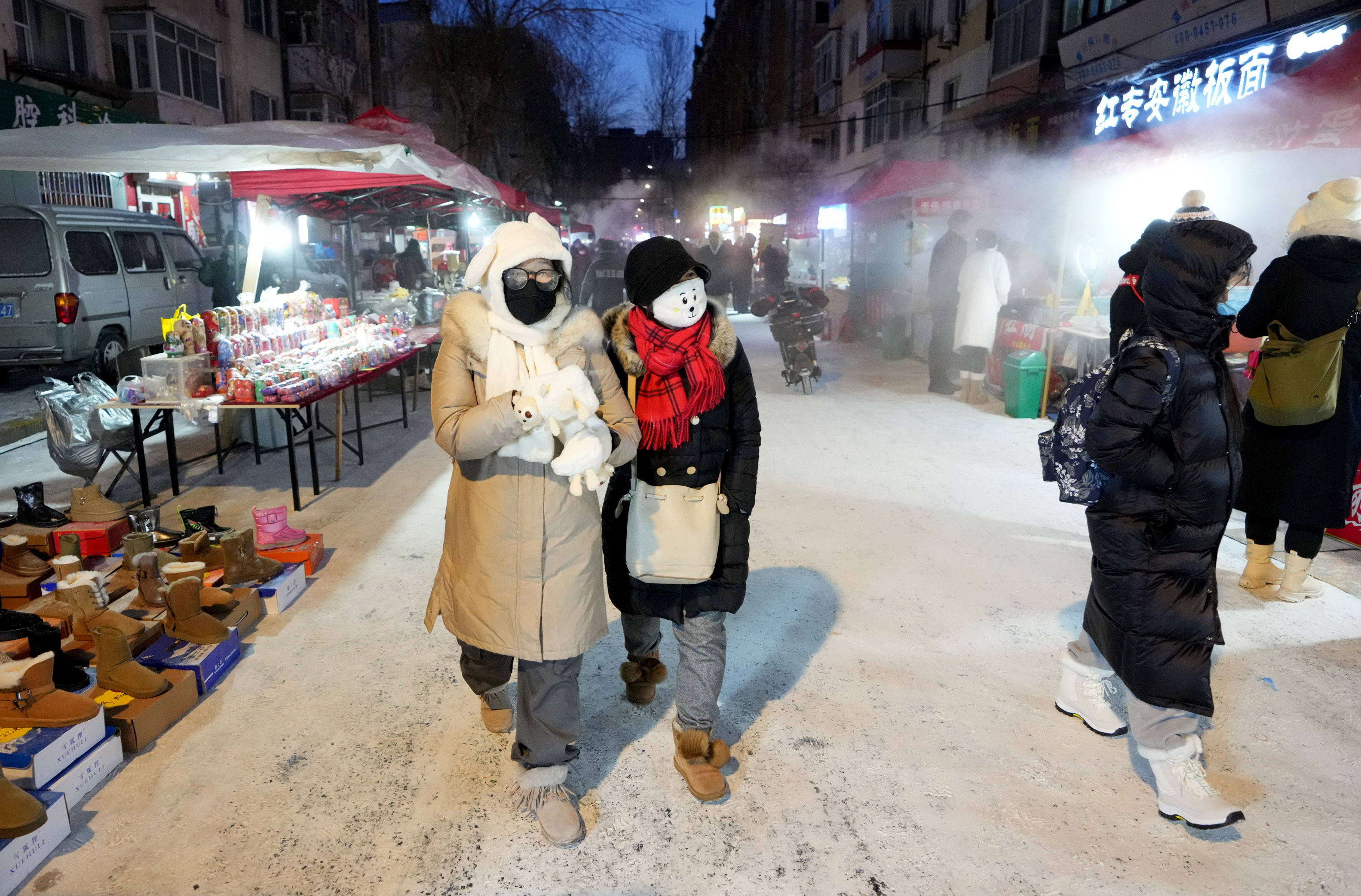 2024年1月22日,在哈爾濱紅專街早市,游客穿著厚厚羽絨服逛街。