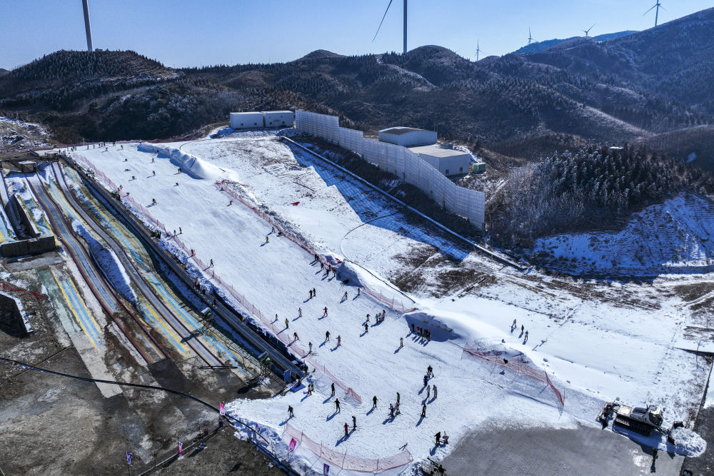 2025年1月11日,人們在成都市大邑縣西嶺雪山雪場滑雪(無人機照片)?,F今四川擁有近50個冰雪旅游區,重點滑雪場16家。省內一些地區還設有室內冰雪場、旱雪場,讓滑雪愛好者全年都能享受“雪上”樂趣。