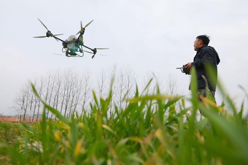 △2025年2月14日,在浙江杭州市臨安區天目山鎮“天目糧倉”糧食功能區,農機人員遙控植保無人機給小麥施肥。