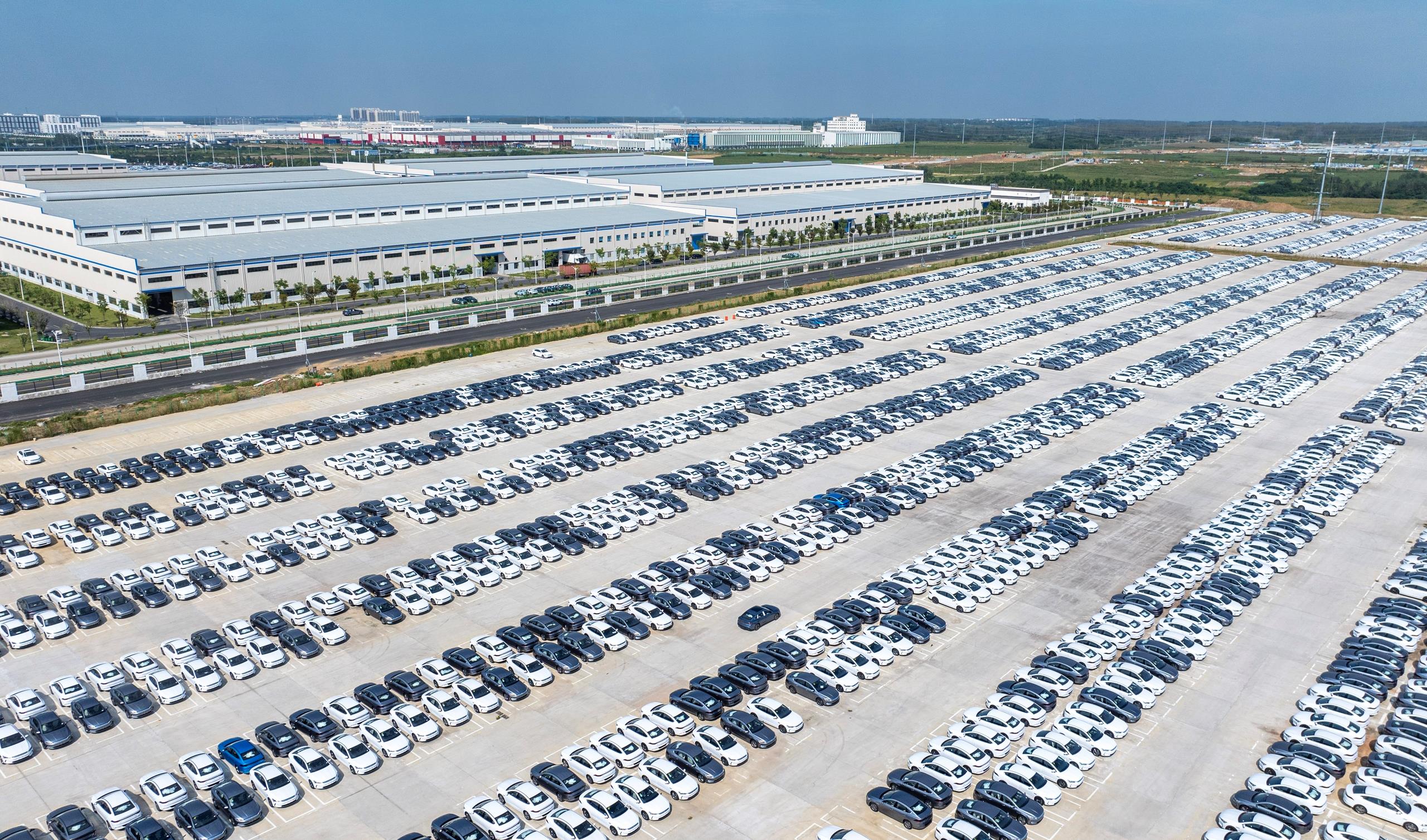 △2024年9月,安徽合肥,整齊停放的新能源汽車正在等待裝車銷往國內外市場。