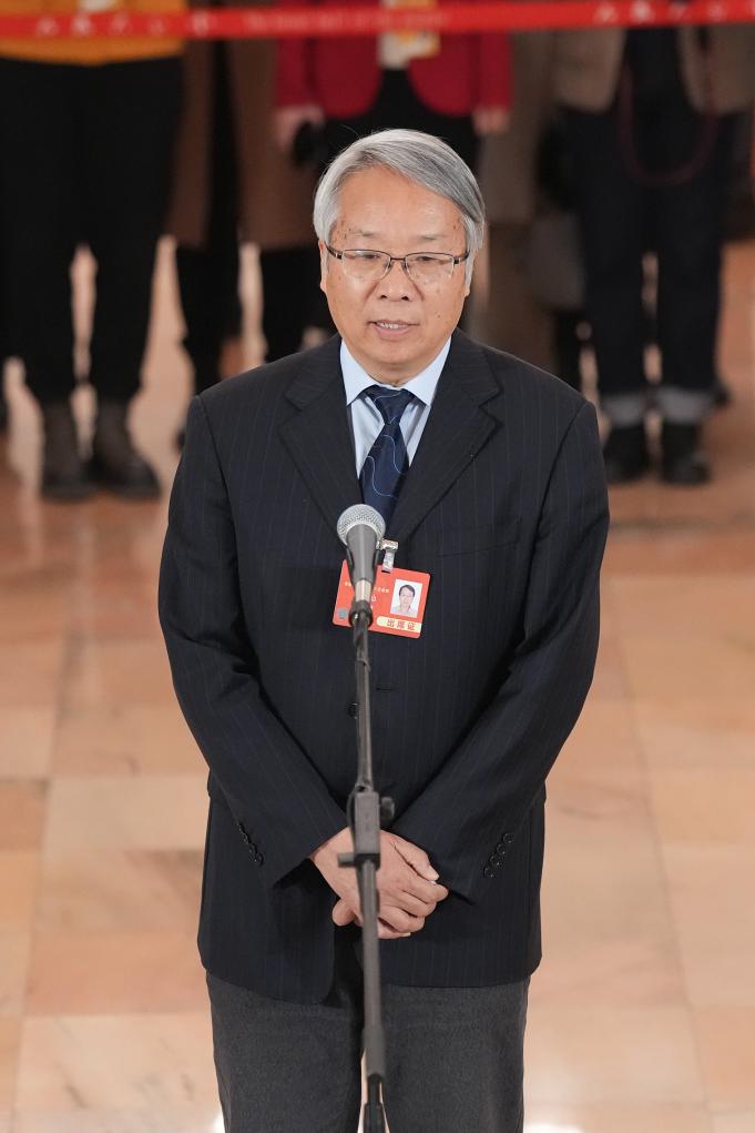 3月10日,全國政協十四屆三次會議第三場“委員通道”集體采訪活動在北京人民大會堂舉行。這是全國政協委員何潤生接受媒體采訪。新華社記者 金良快 攝