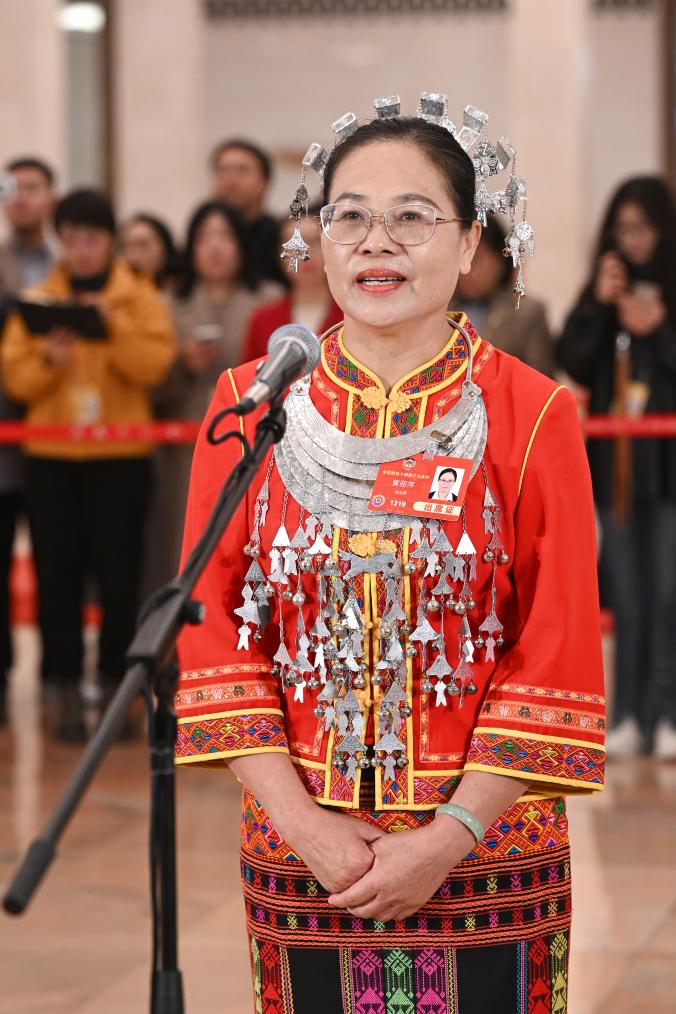 3月10日,全國政協十四屆三次會議第三場“委員通道”集體采訪活動在北京人民大會堂舉行。這是全國政協委員黃麗萍接受媒體采訪。新華社記者 金良快 攝