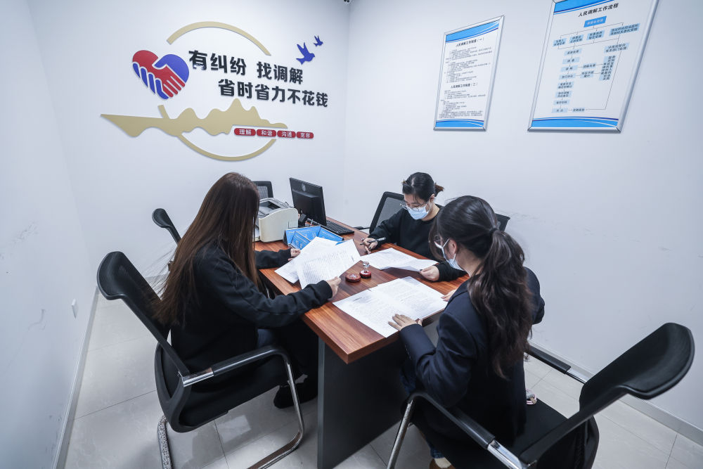 2025年2月25日,在浙江省嘉興市南湖區社會矛盾糾紛調處化解中心,調解員(右一)在調解金融借款合同糾紛。新華社記者 徐昱 攝