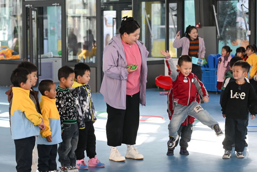 2024年11月14日,在青海省海西蒙古族藏族自治州天峻縣民族幼兒園,小朋友們在老師帶領下上體育課。新華社記者 張龍 攝