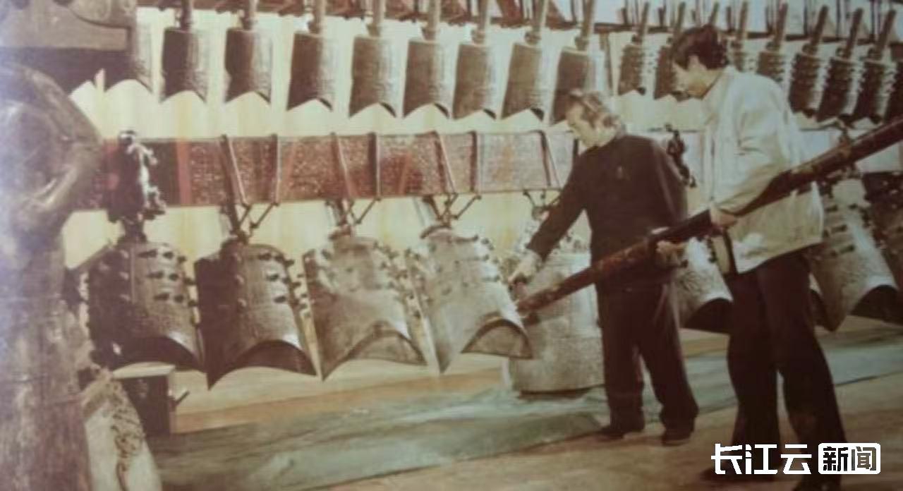 (1978年曾侯乙編鐘出土后的演奏彩排。穿黑色衣服的是當時中國音樂研究所所長黃翔鵬,右邊持棒敲鐘者為時任湖北省博物館副館長馮光生。資料照片) 曾侯乙編鐘自出土到今天,一共只公開奏響過3次原件。第一次是1978年,在曾侯乙編鐘出土3個月后的一場演奏會上,由馮光生奏響;第二次是為慶祝新中國成立35周年,編鐘原件在北京中南海懷仁堂奏響;第三次則是在香港回歸之際,作曲家譚盾為交響樂《1997:天·地·人》破例使用編鐘原件采音錄制,武漢音樂學院教授譚軍就是演奏者之一。 譚軍:印象特別深刻。我們排練節目一直用的就是曾侯乙編鐘的復制件。那是1997年6月3日這一天。我們在練習的過程中,突然被告知,晚上會用原件來錄制,心態瞬間就不一樣了。 當我真正看到那件“神器”的時候,就覺得眼前一亮,光是它本身的鑄造就讓人感到非常震撼,上面的云紋圖細得像頭發絲,是可以拿放大鏡看的,真的會有種全身“炸汗毛”的感覺。 當這樣一個世界級的寶在我手上時,我還真的不太敢去觸摸它,不敢用特別大的力度去演奏。當時譚盾老師就跟我們說,用我們自己內在的這種對先祖的敬畏之情去演奏就達到目的了。