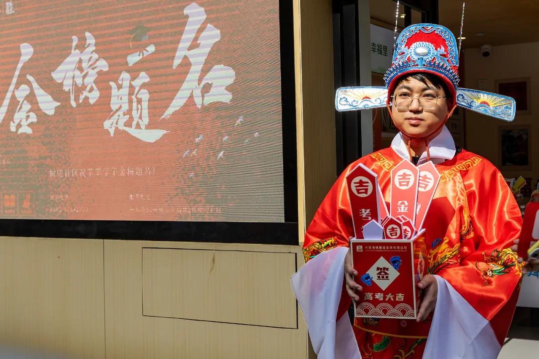 一位志愿者身穿官服 在福建福州一考場外 為考生助陣 滿滿儀式感 愿你馬到成功,圓夢今夏!