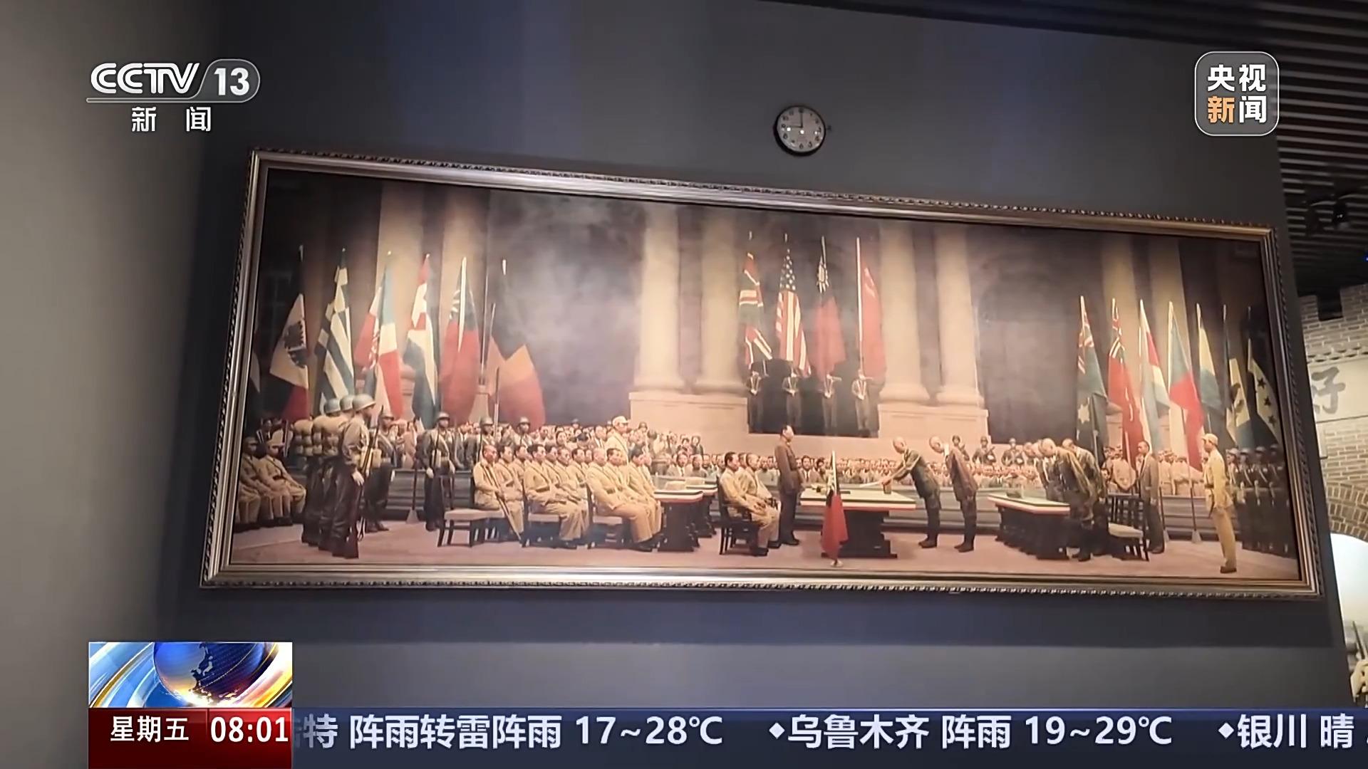 中國人民抗日戰爭紀念館展覽陳列部副主任 韓小昆:左側畫面有個角落,有一把空白的椅子是沒有畫人物的。整個作品形象里面有200多個人,但唯獨空了一把椅子。這是基于歷史進行的藝術創作,就是說,在戰爭中犧牲的英烈們也參加了這個受降儀式。