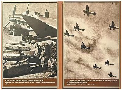 中國人民抗日戰爭紀念館中展示的蘇聯援華航空隊老照片。左側照片為蘇聯援華航空隊成員為飛機裝彈,準備轟炸被日軍占領的臺北松山機場。右側照片為1938年中蘇空軍參加徐州會戰。