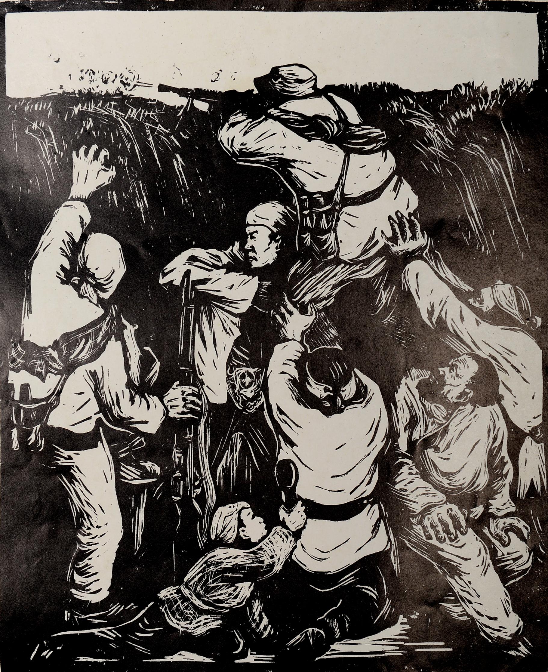木刻版畫《軍民合作 抗戰勝利》。彥涵 作