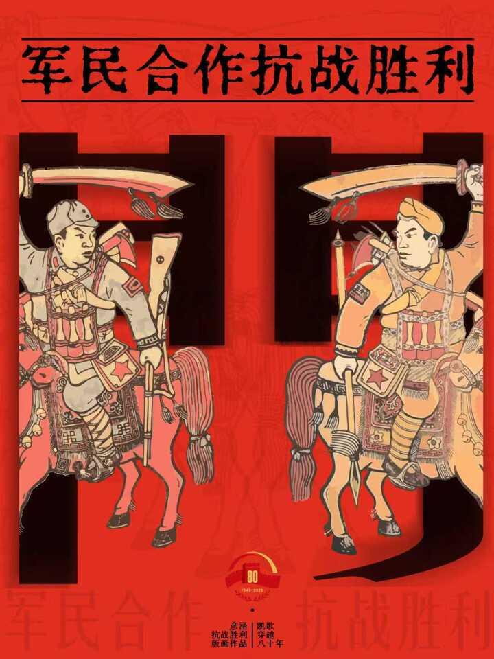 左幅是騎紅馬的八路軍戰士,一手刀過頭頂,一手緊握步槍,胸前還掛著手榴彈;右幅是騎白馬的民兵,手持紅纓槍,高舉閃亮大刀,兩人的威武英姿中都透著果敢堅毅。這對門畫色彩明艷喜氣、線條充滿張力,強烈表達了軍民戰斗到底的決心和迎接勝利的喜悅。