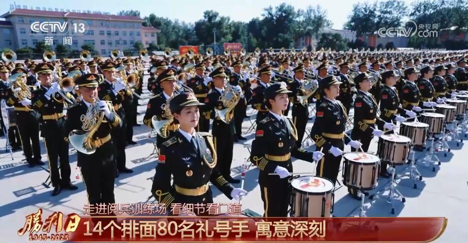本次聯合軍樂團在演奏隊形的編排上,整體設置了14個排面,寓意14年抗戰;前排設置了80名禮號手,寓意抗戰勝利80周年。