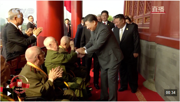 致敬英雄!習近平與天安門城樓觀禮席的抗戰老兵親切握手