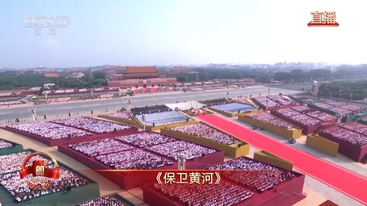 紀念大會開始前,天安門廣場上千人軍樂團、合唱團奏唱抗戰歌曲《保衛黃河》。