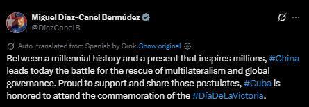 迪亞斯-卡內爾在社交媒體上發文稱,"在綿延千年的歷史與激勵億萬人的當下之間,中國今日引領捍衛多邊主義與全球治理的斗爭。古巴為支持并踐行這些理念而自豪,并榮幸出席勝利日紀念活動。"