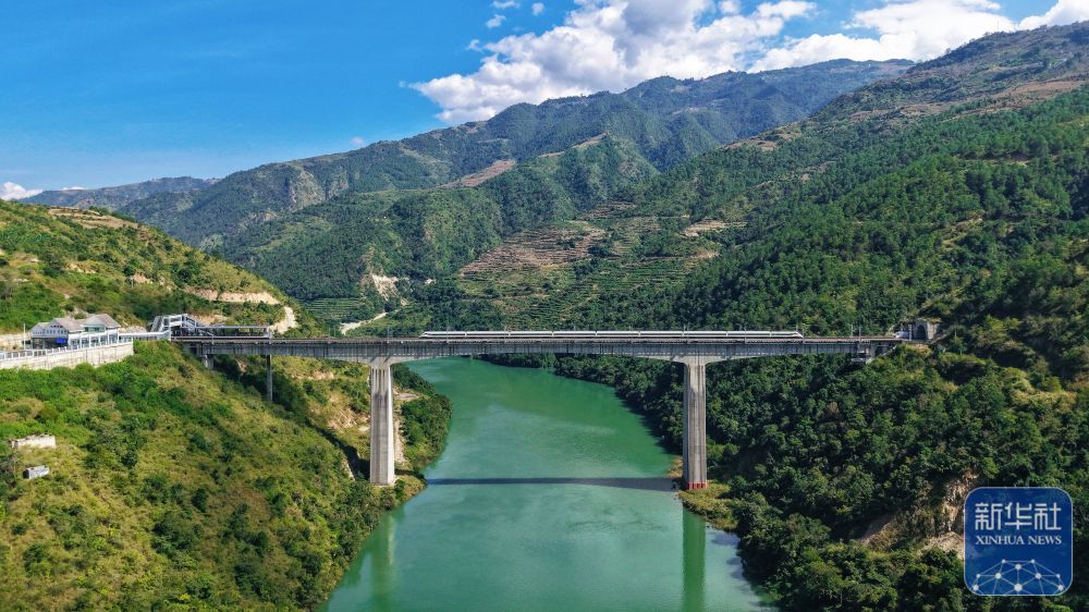 ↑ 10月30日,一列動車組列車經過小灣東站(無人機照片)。