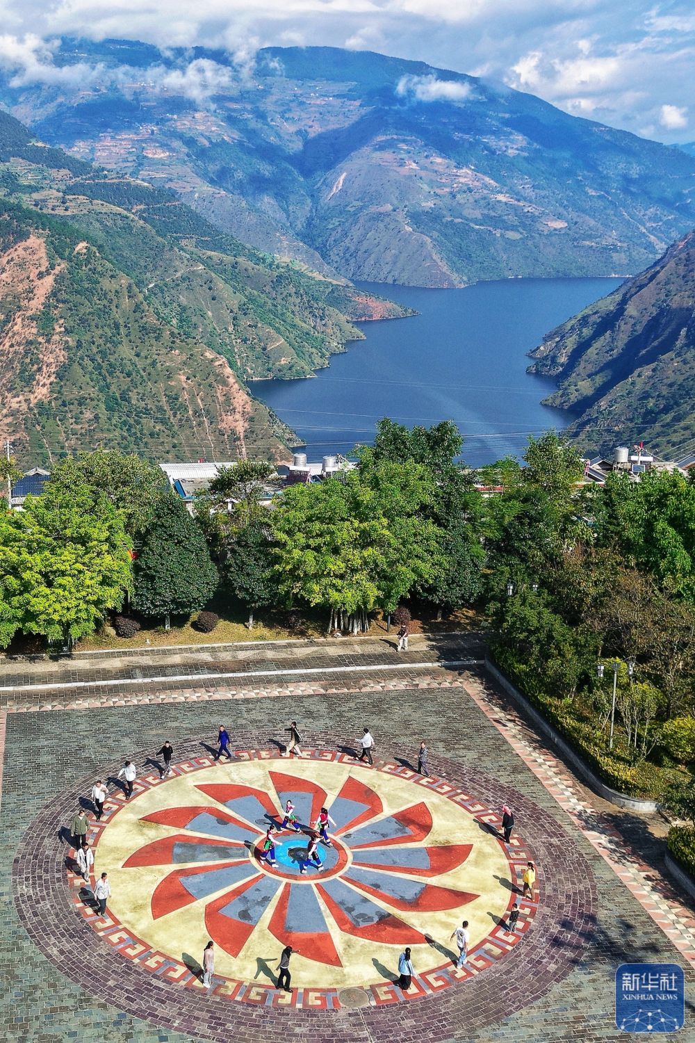 ↑ 10月31日,小灣東鎮居民在瀾滄江畔的移民廣場休閑(無人機照片)。