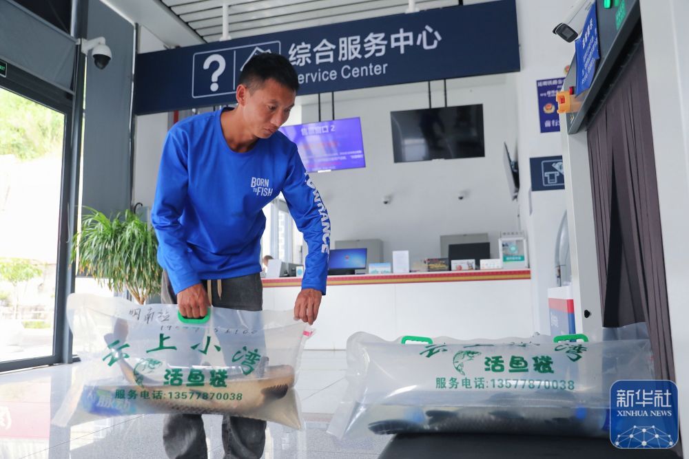 ↑ 10月31日,工作人員將裝袋、加氧后的小灣東鎮生態江魚放上安檢設備,準備通過高鐵動車運往昆明。
