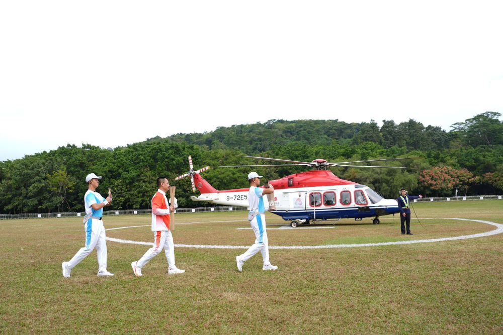 ↑ 火炬手蘭小軍(左二)手持火炬向直升機走去,他將進行空中傳遞。新華社記者 江漢 攝