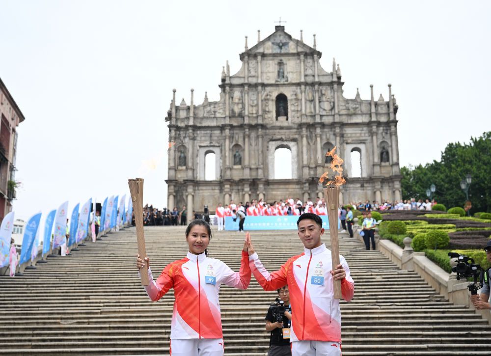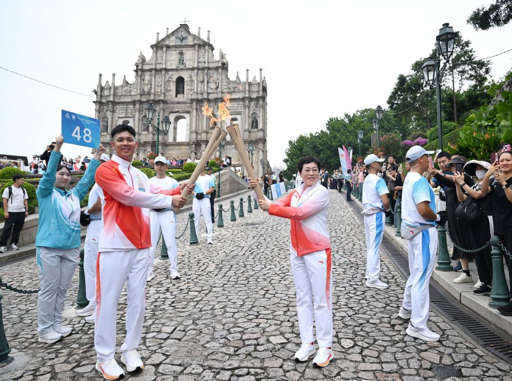 ↑ 火炬手郭建恒(右)、區海欣在大三巴牌坊前傳遞火炬。新華社發(張金加攝)