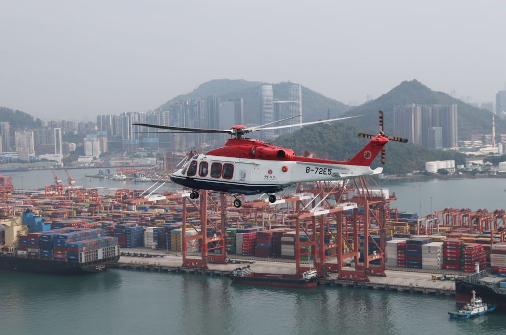 ↑ 搭載圣火的直升機進行空中傳遞。新華社記者 江漢 攝