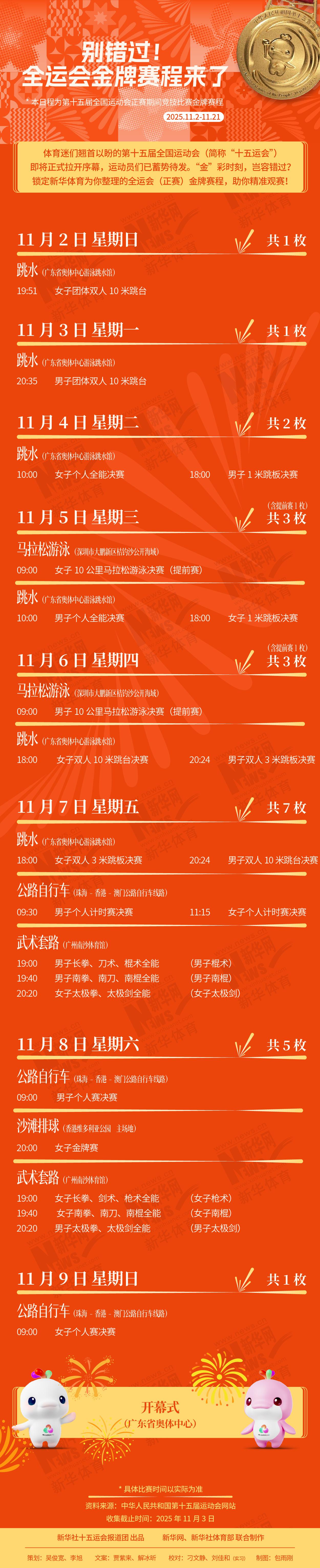 體育迷們翹首以盼的第十五屆全國運動會(簡稱“十五運會”)即將正式拉開序幕,運動員們已蓄勢待發?!敖稹辈蕰r刻,豈容錯過?鎖定新華體育為你整理的全運會(正賽)金牌賽程,助你精準觀賽!