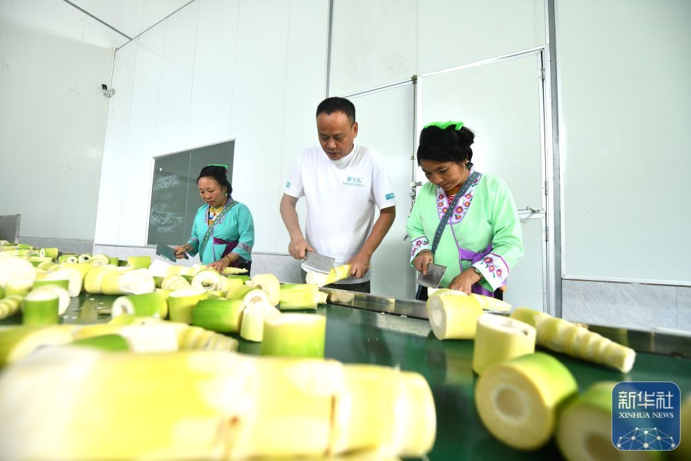 ↑在廣西柳州市柳江區成團鎮六道村一家農業公司生產車間,烏英苗寨婦女梁足英(左)、吳妹富(右)在加工竹筍(6月28日攝)。