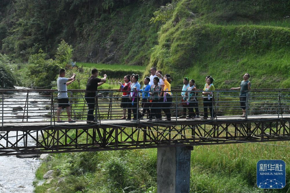 ↑在廣西柳州市融水苗族自治縣桿洞鄉烏英苗寨,幫扶企業負責人和村民在拍攝短視頻,準備用于推介酸筍金湯(9月27日攝)。