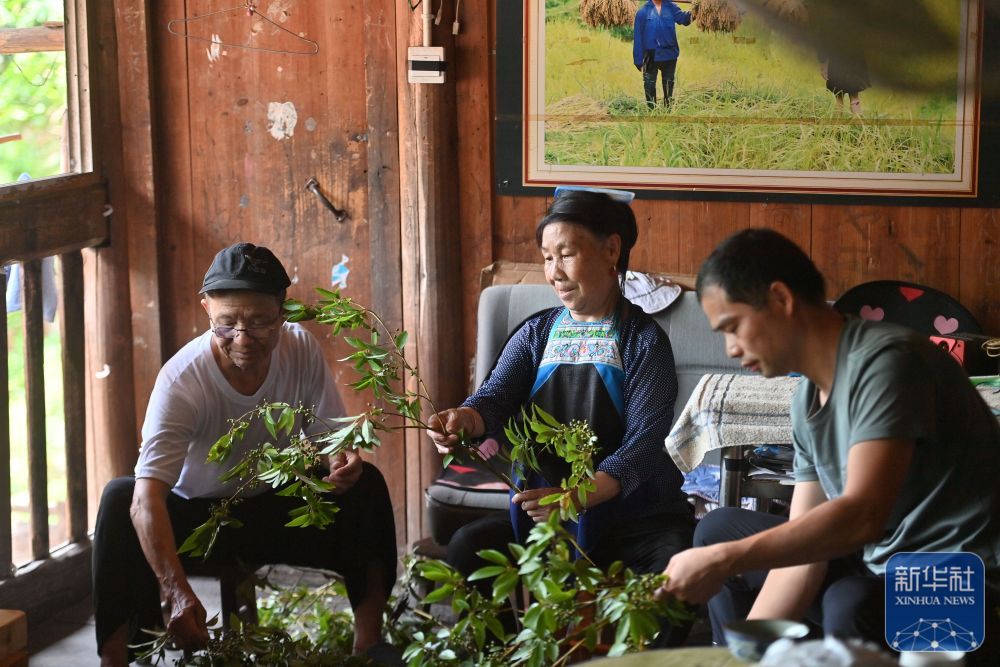 ↑在廣西柳州市融水苗族自治縣桿洞鄉烏英苗寨,村民在整理采收的山蒼子,準備送到幫扶企業,用于制作酸筍金湯(7月16日攝)。