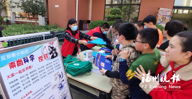 福州新聞網3月26日訊(福州晚報記者 陳木易 文/攝)前日,福州市反邪教協會、倉山區教育局、倉山區科協、倉山區政法委牽頭,在倉山區教師進修學校附屬第二小學舉辦了以“忠誠鑄平安——平安校園我參與”為主題的系列活動。圖為學生們在領取反邪教宣傳材料。
