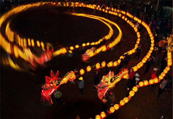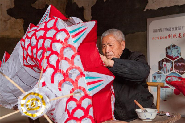 老藝人在制作刻紙龍燈 胡曉鋼 攝 歲末年初,長汀縣童坊鎮彭坊村處處透著一股濃濃的喜慶。一大早,張延玉和彭慕財、彭慕喜三位老人便拎著鑿具箱來到彭氏宗祠,與村委委員們一起籌劃正月刻紙龍燈比賽,舞龍、游龍等事宜。 祠堂正廳,68歲的張延玉抬手掀開塑料袋,三對巨大的紙制龍頭和龍尾依舊活靈活現,栩栩如生。張延玉仔細打量這些由他親手制作的作品?!斑@些龍頭、龍尾都是純手工制作,前后做下來需要一個月的時間,”張延玉十幾歲開始跟著叔公學藝,跟這門技藝打了大半輩子交道,如今他是村里為數不多能夠制作龍頭、龍尾的老藝人。 一條完整的龍燈主要由龍頭、龍身、龍尾三大部分組成,整條龍的骨架用竹蔑扎成,其中龍頭、龍尾表面采用扎、刻、鑿、剪、貼、裱工藝制成,而龍身燈籠上精美細膩的圖案花樣都采用“刻、鑿”的制作工藝。 “制作龍頭龍尾的工藝十分復雜,龍身裝裱用的紙也頗講究,”張延玉說,龍身須用純手工制作、有韌性、透光性強的連素紙,貼上各種圖案,再裝裱在橢圓形八面體的燈籠上,之后固定在屋桷子木板上,即形成龍身。各龍身與龍頭龍尾通過活動撐桿進行接駁,便形成了一條五彩斑爛的刻紙龍燈。 所謂“刻紙龍燈”是用特制的數種尖刃斜口刻刀,將色紙墊在圓木上鑿刻出的“剪紙”,也稱“刻紙”。據傳,由清康熙年間彭氏第十五代祖先彭景周將泉州剪紙藝術、花燈藝術融入在當地的龍燈上,并加以創新組合,融合龍圖騰文化、刻(鑿)紙文化、花燈文化、客家文化等于一身的“刻紙龍燈”,距今已有三百多年歷史。 “舞龍是我們村正月十三到十五的保留節目,每到這時候村里可熱鬧了!”張廷玉說,每年元宵節前,家家戶戶都會動手刻紙、用竹篾扎制龍燈,晚上全村出動,有條不紊地將各家龍燈接駁在一起成為3條完整的龍燈,接駁過程稱為“駁燈”,寓意全村人相互團結、凝聚成龍。 傳承之困,后繼乏人