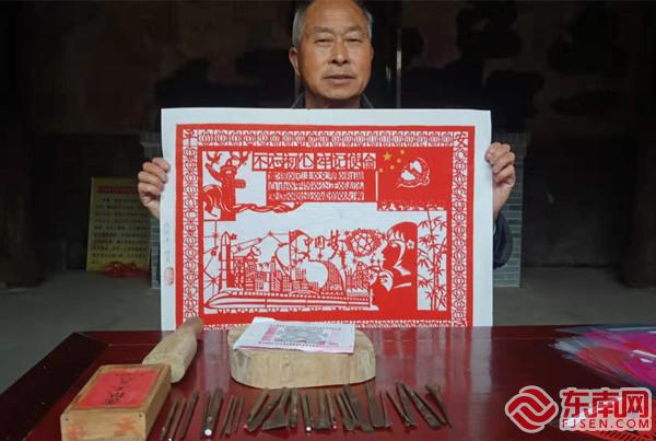 彭慕財老人在展示他的作品。東南網記者 賴志昌 攝 時代變遷,古老的技藝也在傳承中得以創新發展。翻開彭慕財老人的作品集,一張張《中國夢》《不忘初心、牢記使命》等題材的刻紙作品躍然紙上,格外引人注目?!斑@幅《中國夢》是我專門為慶祝新中國成立68周年而創作的,68個燈籠代表68周年,展現當代我們幸福的美好生活?!碧崞疬@幅曾送展的作品,彭慕財頗為自豪。 除了表現傳統題材外,彭慕財、彭慕喜等老藝人還別出心裁地在刻紙龍燈圖案中加入社會主義核心價值觀、黨的十九大精神、鄉村振興戰略等新內容,借助傳統文化傳播好政策、好思想?!八囆g創作也要緊跟時代、貼近時代而創新,傳播當代新思想、新風尚!”彭慕財說。