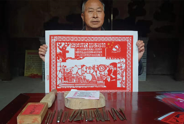 除了表現傳統題材外,彭慕財、彭慕喜等老藝人還別出心裁地在刻紙龍燈圖案中加入社會主義核心價值觀、黨的十九大精神、鄉村振興戰略等新內容,借助傳統文化傳播好政策、好思想。