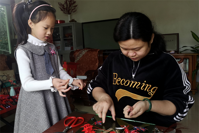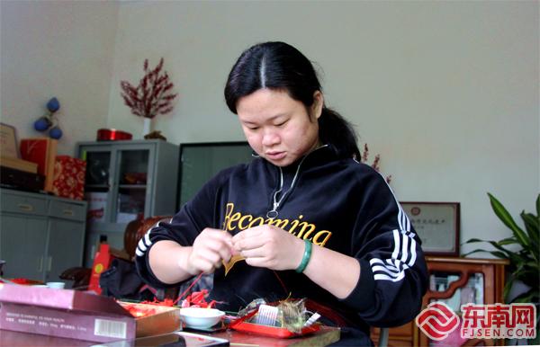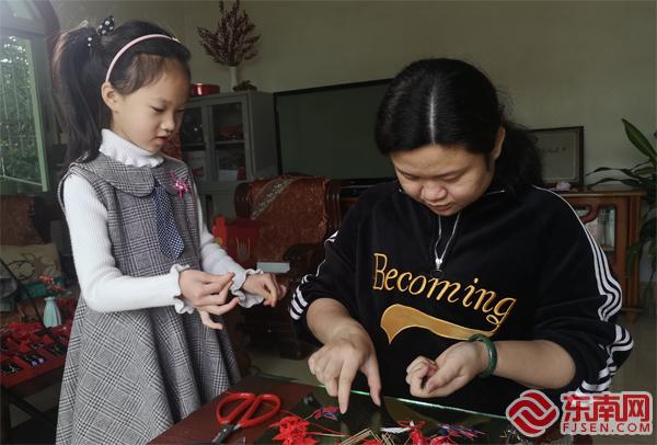 洪曉瑜8歲的女兒學習春仔花。 東南網記者 鄒玒攝 洪曉瑜和洪厝大多數姑娘們一樣,很小的時候就開始接觸春仔花了。7歲時,她便和外婆一起學做春仔花,8歲就賺到自己的“第一桶金”,一共2元錢。 春仔花在洪厝是一種融入生活的習俗。閩南人一生中三件大事—結婚、生子、起大厝(蓋房)都離不開它,白事也常用它做答謝親友的贈禮,因此先前,村民們會在農閑時制作春仔花貼補家用。 如今,在茶余飯后,親友們圍桌“話仙”,即使斟滿了茶,手里依然忙著扎花,既是閑情,也是樂趣。洪曉瑜的母親洪素珍前幾年因眼疾漸漸看不清東西,手卻依然能熟稔地折出花來,絲線纏繞,簡單樣式的花不到一分鐘就在她手中誕生了。 洪厝的不少人家有一張桌子,放著紅線、染成紅色或金色的卡紙以及鐵絲,簡簡單單的工作臺,就能源源不斷地產出春仔花。如今,洪素珍一天要在桌前坐上十個鐘頭,她眼睛不好,但技藝在,做一些簡單式樣的春仔花,五百對一箱地裝好,有客戶需要就可以隨時取用。洪曉瑜則更多編一些花樣繁復的春仔花,編起來更為辛苦,但這已成為多年的習慣了,她笑稱“算是一種胎教”。 洪曉瑜的微信名字叫“守藝人”,她希望將春仔花代代相傳,結出碩果。如今,她8歲的女兒也在學習春仔花,她和其他傳承人更是將春仔花帶到了校園?!斑@是屬于閩南文化的獨特記憶,開課的時候,我們第一堂課往往不教上手操作,而是讓孩子們了解這項習俗?!焙闀澡ふf,她們在翔安中心小學、洪厝小學都開設了興趣課程,每周一節。此外,她們還與當地的社區開辦春仔花培訓班,不定期走進廈門大學、集美美術學院等各大高校,讓更多的人了解、體驗春仔花。 一段緣 帶動春仔花花開兩岸