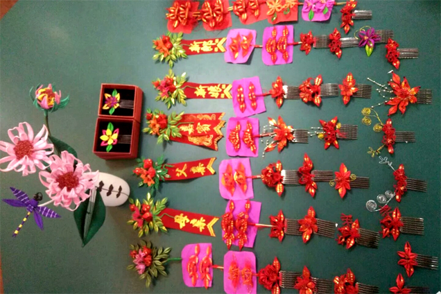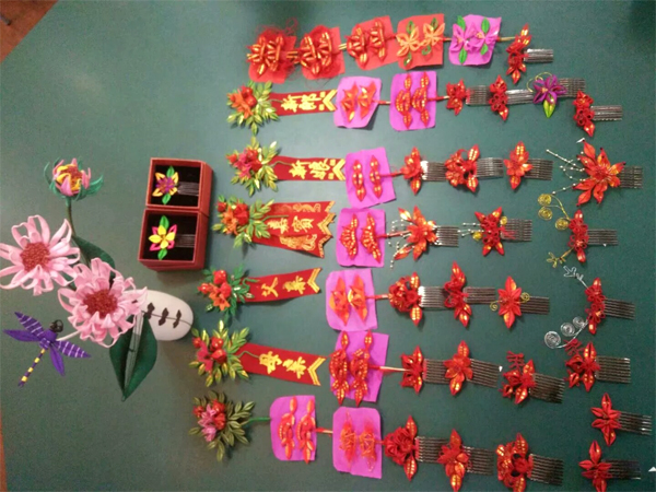 用于結婚的春仔花。 受訪者供圖 或許是手指纏繞鐵絲、絲線的手法變化神奇,或許是春仔花習俗給人以欣欣向榮的意味,洪厝的姑娘們做春仔花的手藝就這樣傳了出去。有嫁出去的女兒,就有春仔花的“開枝散葉”;嫁到村里的媳婦,在耳濡目染下,也開始喜歡這紅彤彤的“傳家寶”,學成后教給娘家的姐妹們。 經過幾百年的傳承和發展,春仔花如今形成了婆婆花、新娘花、普通花、孩童花以及喪事花等十來個品種,每種花擁有不同的含義,在不同的場合供大家使用。 結婚,是春仔花“出席”最多的場合。新娘的媽媽精心選擇十二對(閏年十三對)春仔花,讓新娘帶到婆家。這其中就有婆婆花、新娘花、姑娘花、妯娌花等,每一對花的元素都有講究。