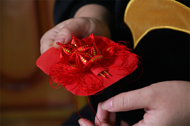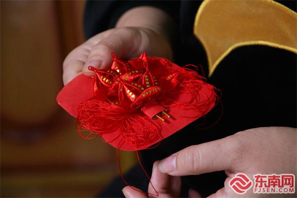 小小的“婆婆花”蘊含著許多吉祥的寓意。 東南網記者 鄒玒攝 “比如‘婆婆花’,正中間的石榴象征著多子多福,小葉子代表‘開枝散葉’,兩旁的‘面線須’代表老人福壽綿長,挖耳勺是‘婆婆花’必備的,表示媳婦娶進門,婆婆可以安心享福了。同時要注意的是,‘婆婆花’有前有后,‘前’在閩南話中有‘財’的意思,在普通話中與‘錢’諧音?!焙闀澡ふf,小小的一對花,需要講究的地方非常多,“新娘花”中的“雙石榴”元素也包含了早生貴子、一世幸福的美好寓意?!霸谖覀冞@里,春仔花的品類非常多,無論紅事還是白事,都能見到它的身影”。 洪曉瑜的母親洪素珍四十多歲時,便開始為洪曉瑜準備結婚用的春仔花了,在她看來,每一根線也代表著她對女兒的牽掛?!爸两裎疫€留著媽媽送我的春仔花?!焙闀澡ふf。 一根線 串聯洪厝代代傳承