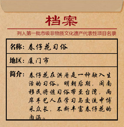春仔花習俗在洪厝有五百年以上的歷史。經過傳承和發展,春仔花如今形成十來個品種,吸引不少閩南及臺灣地區的人前來學習、訂貨,在交流中博采眾長,將當下流行的文創理念融匯其中。