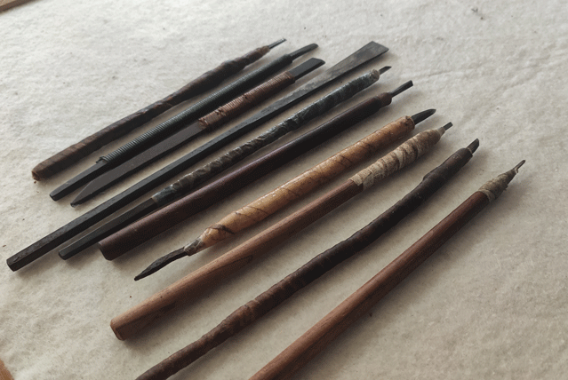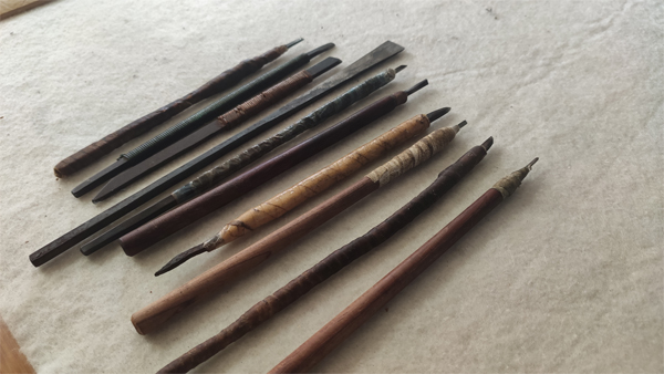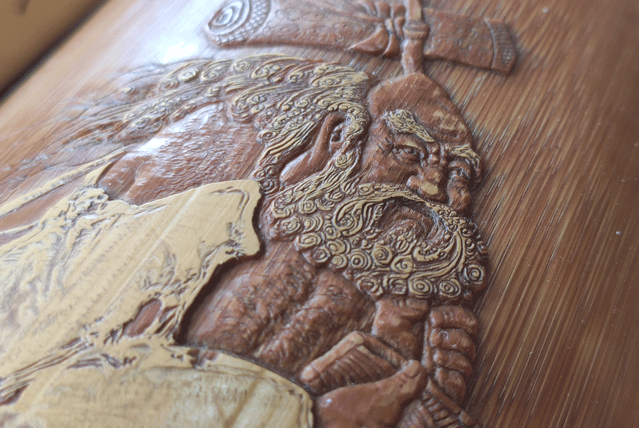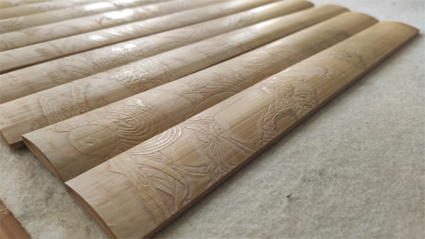 留青竹刻制作工具。東南網記者楊超斌 攝 在工作室里,劉志高向筆者展示了形如楔子的刀刃。他說,每次創作都是漫長的過程,有時一天只能刻三、四個字??坍嫳瓤套指鼜碗s,用的刀具更多。有圓頭的、扁頭弧形似鏟子的,大大小小超過20把。一幅30厘米×10厘米的作品,得刻一兩個月。 刻刀掠過,竹花翻卷。劉志高“刀起刀落”,技法嫻熟,將尋常的竹子化為栩栩如生的藝術作品?!傲羟嘀窨讨谱黜樞驗槊璁?、割線、刮面、鏟底、采皮、挑腹、打磨等。只有沉下心來,才能在竹刻技法上不斷突破,雕出精品?!?/p>