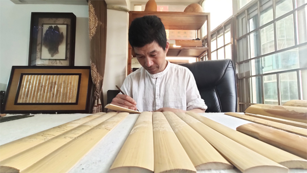 劉志高的留青竹刻作品。東南網記者楊超斌 攝 藝術需要傳承和創新,才有特色和價值。上世紀80年代末,國內工藝品市場尚未形成規模,許多“手藝人”靠手藝僅能維持生活。留青竹刻更屬于冷門藝術,那時花一兩個月刻的一片作品還不值百元。因喜歡留青竹刻,劉志高將其作為修身養性的習慣。 “小時候,在前輩們的熏陶下,我對留青竹刻情有獨鐘,常跟在他們背后觀察學習。念初中時,我邊學功課邊學雕刻。希望世代相傳的劉氏竹刻工藝不要到我們這一代荒廢?!眲⒅靖呋貞浾f。 留青竹刻工藝技法要求創作者具備繪畫、書法等功底?!跋扔谢A,才能入刻?!眲⒅靖邚男¢喿x家中古籍,同時學畫。1992年初中畢業,自幼酷愛繪畫的劉志高進入廈門鼓浪嶼學國畫,并到中國書畫函授大學研修山水畫。他接過祖傳的“接力棒”,潛心鉆研留青竹刻藝術。此后,整整7年時間,他甘于寂寞和清貧,常常獨守雕刻室,一坐就是好幾個小時,用繡花針般的刀具勤練刀法。