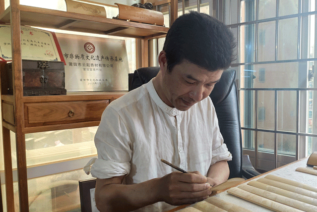 劉志高創作留青竹刻。東南網記者楊超斌 攝 莆田市地處福建中南部,竹資源豐富,為竹刻藝術創作提供了保障?!懊駜赡晏?、四年太老,三年的剛剛好?!眲⒅靖哒f,砍下毛竹后,剖成竹片,然后立即用熱水蒸煮、磨砂,做防止蟲蛀等處理,幾道工序走下來,才能制成竹刻的原材料。 據記載,留青竹刻始創于唐宋,明清時期漸成為一門獨立的藝術種類。劉氏竹刻作為中國竹刻的一支流派,主要分布在今天的莆田。清代乾隆中期,劉氏入閩第36代裔孫劉材成創辦竹木雕作坊。如今,莆田留青竹刻第七代傳承人劉志高秉持古學遺風,以為學創新為動力,打破家傳模式與演教授藝的傳承方法,先后在莆田建立了竹刻研究所,成立莆田雕塑學會。 據介紹,2004年至2018年間,劉志高參與非遺文化申報、保護階段的工作,以及中長期十年規劃綱要大綱的可行性報告研究及編制。他自創的陷地留青刻在全國及世界性竹藝術交流及展演中多次獲獎,也成就了福建竹刻藝術在中國單項非遺項目名錄的地位。莆田劉氏竹刻因此名聲鵲起。