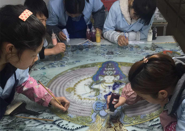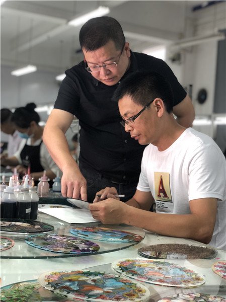 趙獻正在指導工人作畫。受訪者供圖 趙獻說道,學藝是需要下苦功夫的,例如彩繪玻璃上色,描線等有時需要一坐就是很多個小時,很多年輕人吃不了這些苦。找到合適的工人和畫師也費功夫。 推陳出新融入“中國風”