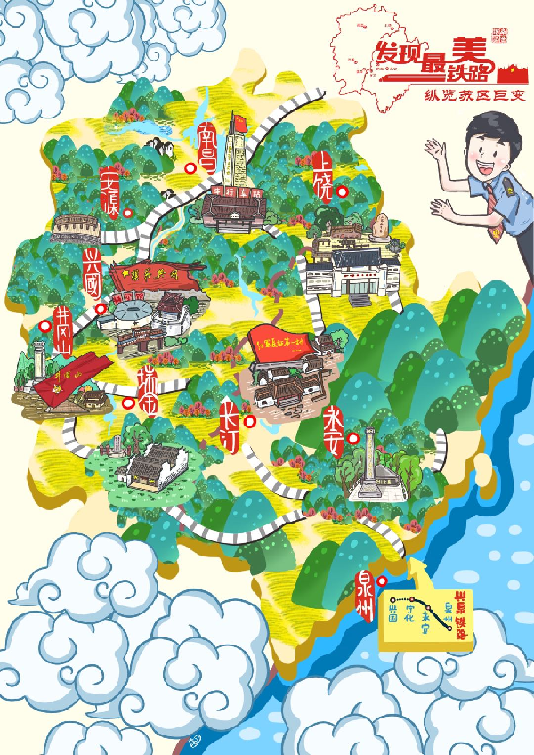 贛閩鐵路紅色環線示意圖。圖片來源:中國鐵路南昌局集團有限公司 4月23日至26日,參加該活動的媒體采訪團一行40余人,從英雄城南昌出發,沿著京九、贛瑞龍、南龍鐵路及昌贛、合福、滬昆高鐵組成的環線鐵路,重溫革命往事,探尋紅色故事,縱覽發展變遷,感悟初心傳承。南昌、興國、瑞金、長汀、清流、永安、上饒……由贛入閩,出閩入贛,4天時間雖然短暫,但媒體采訪團記者進車站、聽黨史、訪企業、入工地……通過實地探尋、走訪,見證鐵路在贛閩大地不斷延伸,沿途革命老區的經濟在快速發展。 上饒火車站:五次嬗變鑄就亮麗名片 據介紹,上饒火車站是全國首座垂直騎跨式高鐵樞紐站。滬昆高鐵、合福高鐵和滬昆鐵路在此呈十字交匯,形成了三場兩所格局,旅客可在站內方便快捷地實現無縫換乘。目前,該站日均??苛熊?00多趟,是江西省內??苛熊囎疃嗟幕疖囌?。平均每日到發旅客5萬余人次。 上饒站黨總支書記陳衛紅告訴記者,火車站始建于1935年,經過1953年、1998年兩次原址重建,2006年搬遷到現址,2014年新站房落成運營,歷經了“五生五世”。贛東北的上饒因地理位置優越,交通便利,自古就有“八方通衢”“豫章第一門戶”之稱,鐵路的發展,車站的升級就像為饒城發展插上了隱形的翅膀。