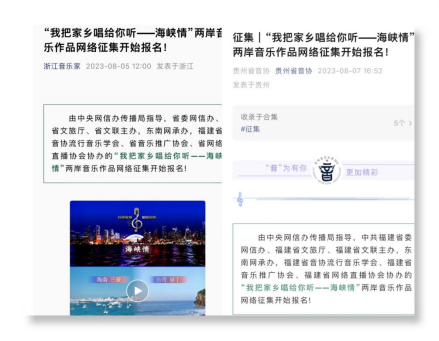 “我把家鄉唱給你聽·海峽情”海峽兩岸音樂作品網絡征集評選活動是一場聚焦海峽兩岸、面向全球華人華僑音樂愛好者的大型原創音樂盛會,旨在以音樂為橋梁,充分挖掘海峽兩岸靚麗的自然風光與深厚的人文歷史,用不同的鄉音和曲風,把家鄉的美用歌聲唱出來。網絡征集開啟以來,組委會每天都收到十多首參賽作品,咨詢報名情況的人非常多。浙江、貴州等省音協紛紛在官方公眾號進行刊發,關注這次活動。