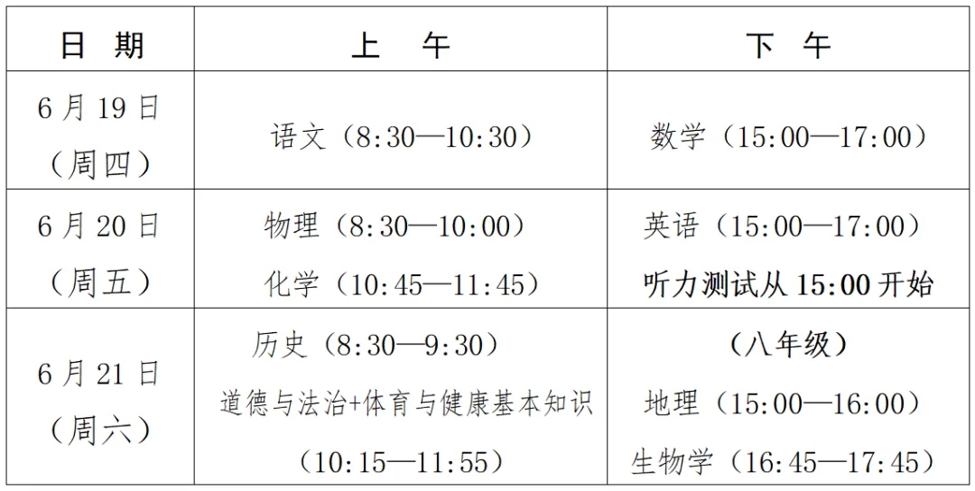 根據《福建省教育廳關于印發福建省高中階段學??荚囌猩贫雀母飳嵤┮庖姷耐ㄖ罚ㄩ}教基〔2018〕66 號)和《福建省教育廳關于印發福建省初中畢業升學體育與健康考試實施方案(試行)的通知》(閩教體〔2020〕18號)等文件要求,我省初中學業水平考試(以下簡稱“中考”)的語文、數學、英語、道德與法治、歷史、地理、物理、化學、生物學等9個科目及體育與健康基本知識考試實行省級統一考試,全部實行書面閉卷筆試形式。其中,《道德與法治》科目與《體育與健康基本知識》考試同場合卷進行。經研究,2025年中考省級統一考試安排在6月19日—21日舉行,具體科目考試時間安排如下: