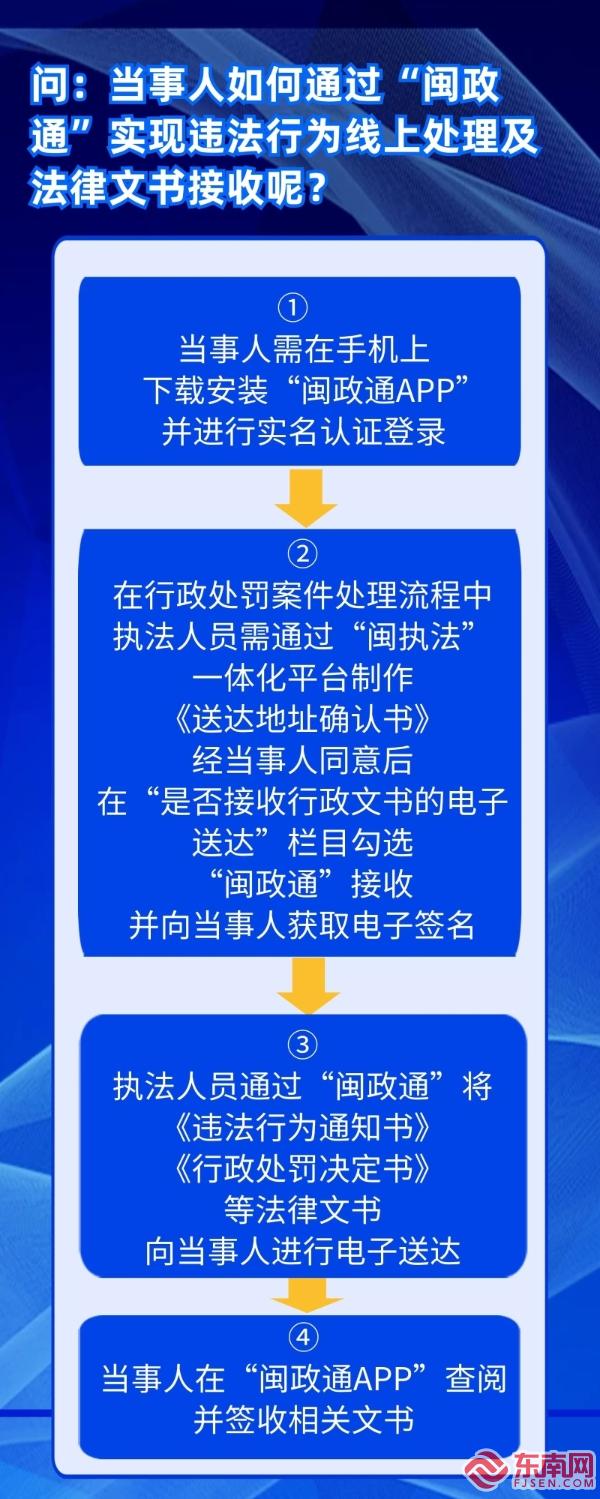 “閩政通”電子送達流程(廈門市交通執法支隊供圖) 東南網2月27日訊(本網記者 劉瑋 通訊員 傅秋萍)日前,記者從廈門交通執法部門獲悉,市交通執法支隊積極推進“閩政通”電子送達,依托一體化平臺“閩政通”實現案件線上處理、文書電子送達、遠程簽字、線上繳交罰款,完成了廈門交通執法領域首單電子送達。 近期,直屬大隊調查一件12328投訴件,1月24日當事人前來配合調查。經核查,查明駕駛員楊某存在網絡預約出租汽車駕駛員無正當理由未按承諾到達約定地點提供預約服務的違法行為,且是一年內第二次違法,屬于嚴重情節,應當給予行政處罰。 為便利當事人接收相關文書,使群眾少跑腿,直屬大隊積極嘗試,探索通過“閩政通”APP進行法律文書電子送達。1月26日,當事人楊某在老家通過其“閩政通”對《違法行為通知書》《行政處罰決定書》等文書進行線上遠程電子簽收并予以繳款,極大優化群眾辦事體驗感。 當事人如何通過“閩政通”實現違法行為線上處理及法律文書電子送達?相關執法人員介紹,首先,當事人需在手機上下載安裝“閩政通APP”,進行實名認證登錄。其次,在行政處罰案件處理流程中,執法人員需通過“閩執法”一體化平臺制作《送達地址確認書》,經當事人同意后在“是否接收行政文書的電子送達”欄目勾選“閩政通”接收,并向當事人獲取電子簽名。最后,執法人員制作并審批《違法行為通知書》《行政處罰決定書》后就可以通過“閩政通”實現電子送達,當事人可在“閩政通APP”查閱并簽收相關文書。 “通過‘閩政通’進行案件文書電子送達能夠實現文書的即時傳遞,比傳統的直接送達、郵寄送達更高效、更便捷,違法當事人可隨時隨地獲取、查閱文書內容?!眻谭ㄈ藛T說,電子送達記錄還可追蹤和查詢,有效避免紙質文書在傳遞途中可能出現的損毀、遺失以及信息泄露等問題。 |